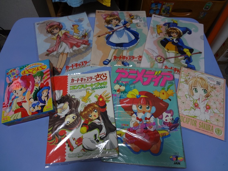 カードキャプターさくらのクリアファイル3枚(写真上3枚)、カードキャプターさくら コンプリートブック・クロウカード編(やや左下)、アニメディア 1992年1月号(やや右下)、セイカのかるた アイドル天使ようこそようこ(写真一番左)、カードキャプターさくら メモ帳&封筒&シール(一番右)。