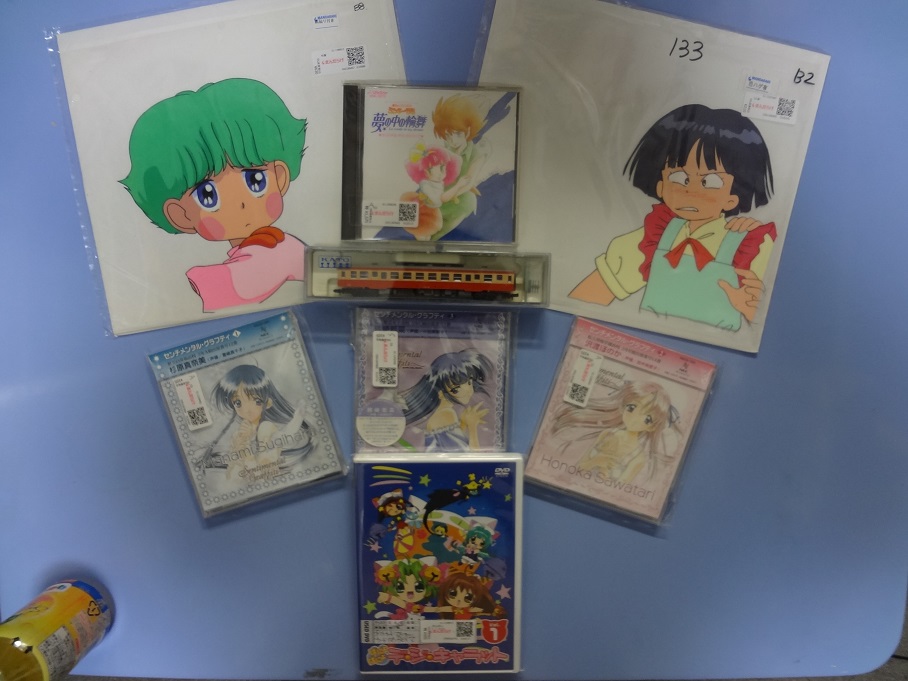 セル画2枚(一番上)、ミンキーモモ 夢の中の輪舞 OST(中央上)、キハ52 一般色(一番中央)、センチメンタルグラフティCD3枚(中央下)、デ・ジ・キャラットDVD(一番下)。