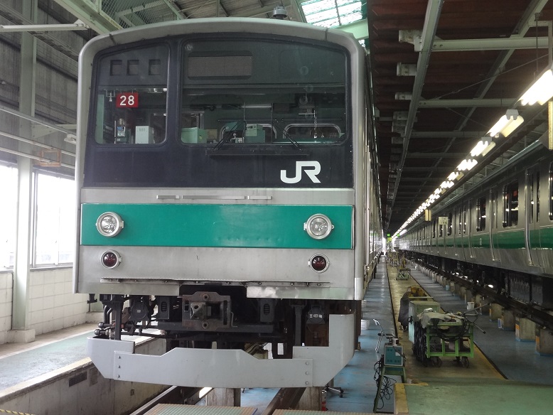 川越車両センターの検修庫に留置する、205系ハエ28編成。(2013年10月19日開催の川越車両センター祭りで一般公開された時に撮影)
