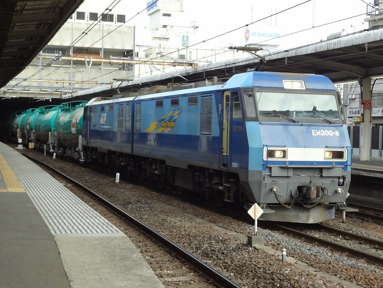 タンク車を牽引する、EH200-8ブルーサンダー。