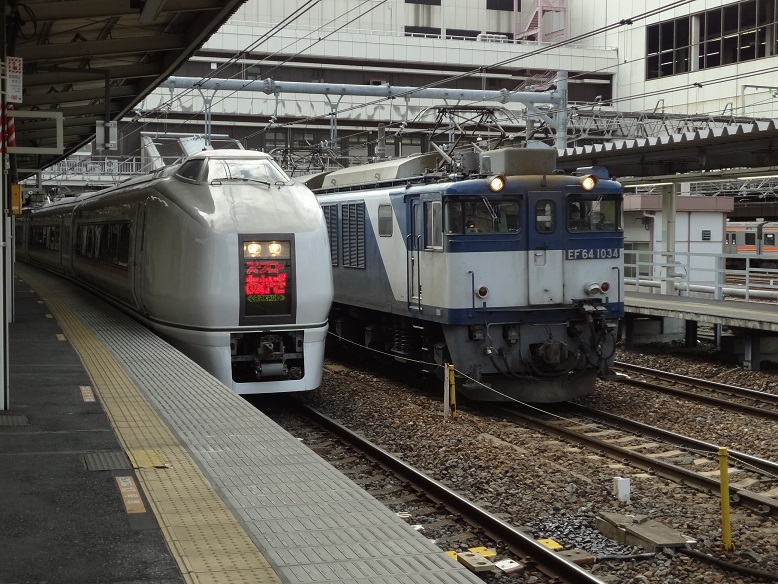 さっき7番線に停車していた、651系1000番台11両編成。回送列車であるにも関わらず、まだ「スワローあかぎ」と表示されていました。右はEF64-1034による貨物列車。